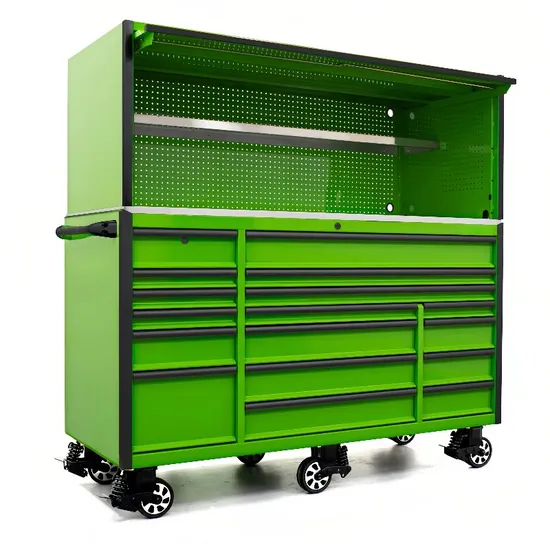 Ample Storage: Features a top storage, several drawers, and a bottom cabinet with an adjustable shelf, providing plenty of space for power tools, hand tools, and parts.